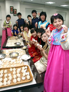 So, Grace and I arrived to the apartment on the fifth floor, with no elevator (I feel sorry for the 8th floorers), immediately greeted by my two uncles, their wives, and their kids. Also immediately came the food and strange Korean snacks that I vaguely remembered eating when I was young. Everything was said in Korean so their was a LOT of translating going on. Then, the women and children made traditional rice cakes called songpyeon. Afterwards, we ate dinners and by the way, ALL meals look like this. You always have a main dish, rice, a soup, and a ton of side dishes (and one of them of course has to be kimchi).